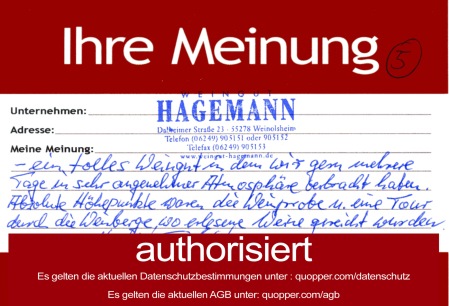 Das Weingut Hagemann verdient nach unserer Meinung in allen Bereichen das Prädikat sehr gut.Aus diesen Gründen sind wir ein Mehrfamilien-Sammelbesteller. Auftretenden Bestellprobleme werden stets zu voller Zufriedenheit der Kunden gelöst. Wir empfehlen das Weingut mit bestem Gewissen weiter.