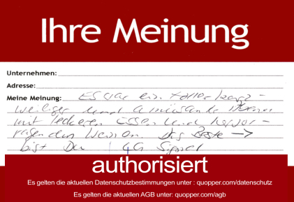 *Rechtlicher Hinweis: „quopper verlinkt die veröffentlichten Rezensionen, Texte und Bilder auf die Website des jeweiligen Kunden (Links und Verweise auf Websiteangebote Dritter). Die Verantwortung für diese fremden Inhalte liegt ausschließlich bei dem Anbieter, der diese Inhalte und Angebote bereithält. Den Nutzerinnen und Nutzern von quopper wird mit diesen Links allein der Zugang zu diesen Angeboten vermittelt. Für rechtswidrige, fehlerhafte oder unvollständige Inhalte sowie für Schäden, die aus der Nutzung dieser Websites entstehen, haftet allein der Anbieter der Seite, auf welche verwiesen wurde.“ hier geht`s zu unseren AGB